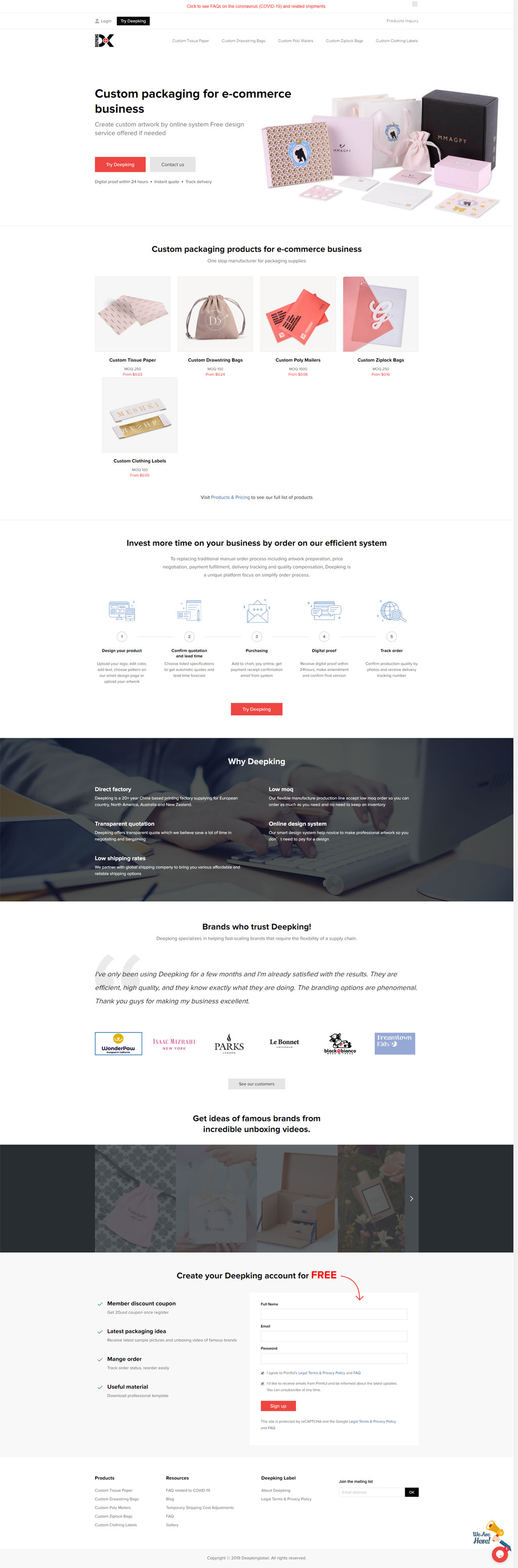 Deepking Industrial Company Limited (“Deepking”) is one of the Chinese leading packaging companies specialised in garment packaging, cosmetic packaging and jewelry packaging items We have been serving for more than 400 established international brands in the last 20 years